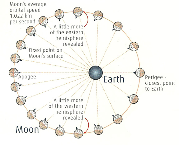 At one time, the Moon was actually a part of the Earth. That is, until an object the size of Mars came hurtling through space, hit the Earth, turned her to a molten fiery mess and scattered some of the mantle into orbit. These fragments eventually formed what is now the Moon. The face that we see on the Moon is actually made of ancient lava fields known as maria. The Moon is tidally locked to the Earth, which is why we only ever see one side. Here’s a nifty little diagram to illustrate this concept.